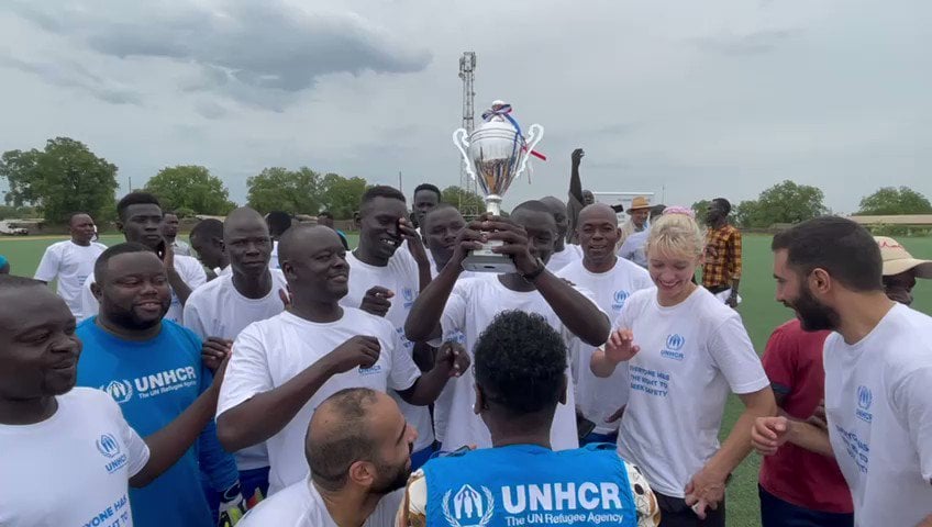 Refugees and UNHCR staff celebrated World Refugee Day in South Sudan with a football match at the training ground of national soccer team “The Bright Stars”. A UNHCR team featuring UN staff and displaced players from Sudan and Ethiopia faced off against a refugee team from Rwanda, Sudan and Burundi. With the teams tied at one all after normal time, the match was decided on penalties with the UNHCR team claiming victory after the winning goal was scored by a refugee midfeilder from Sudan. Here's the team claiming the silverware...